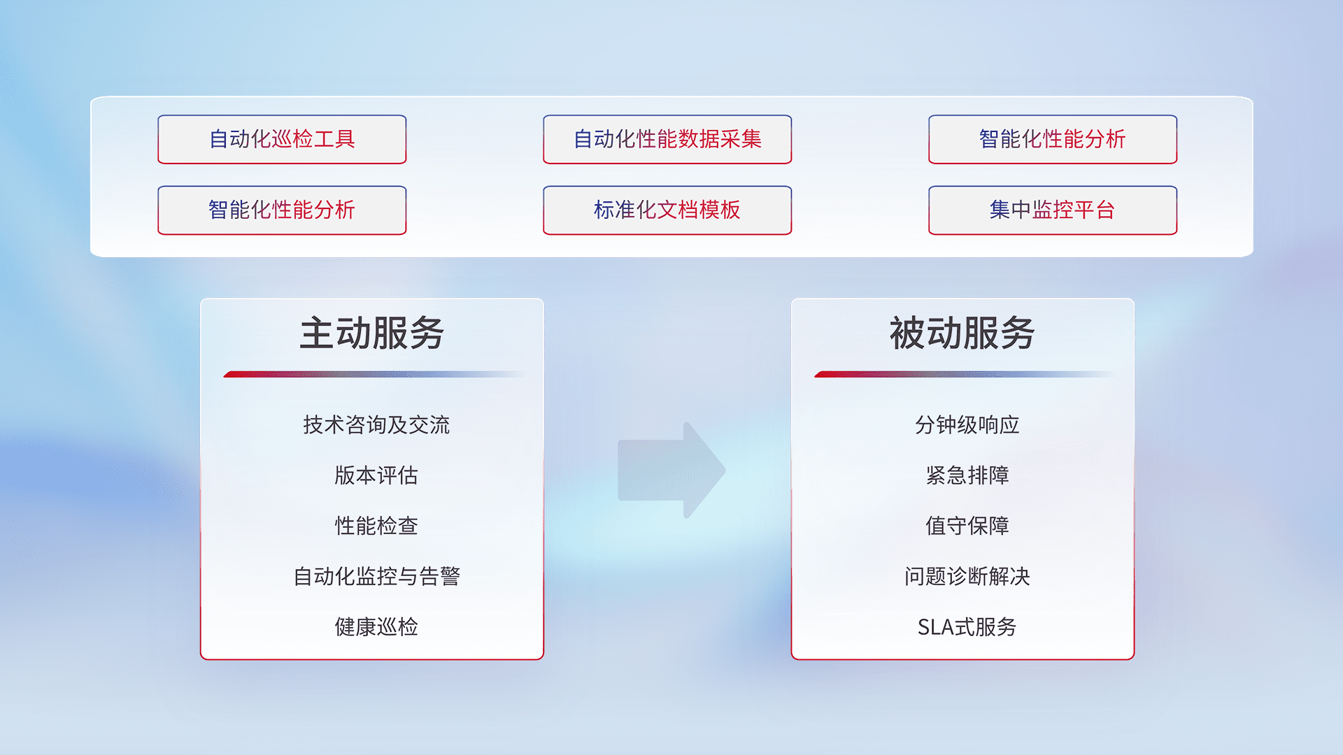 智能化工具和标准化文档,,,,保障服务质量,,提供主动服务(包含技术咨询、、、版本评估、、、性能检查、、、、自动化监控与告警、、健康巡检)和被动服务包含(分钟级响应、、、紧急排障、、值守保障、、、、问题诊断解决、、SLA服务)。。